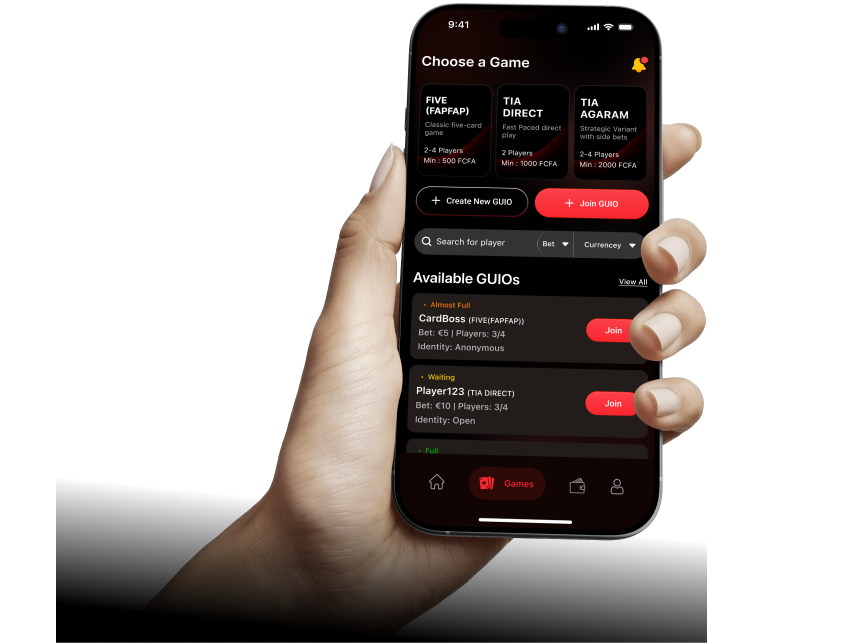 Join real players, create or join game rooms (GUIO), place bets in FCFA, EUR, or USD, and win based on strategy — not luck alone.'